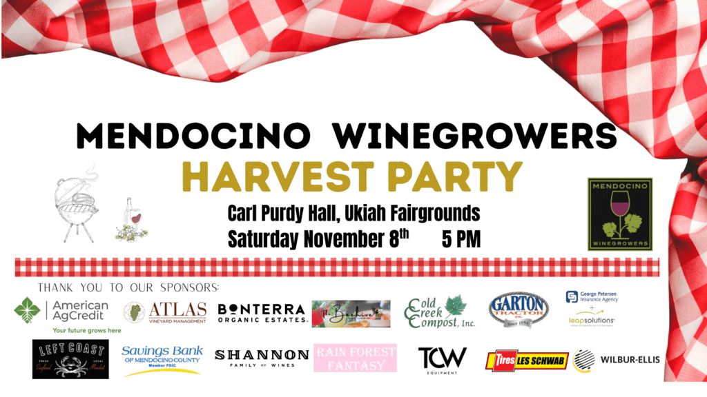 Join us on Saturday, November 8, 2025, at 5 p.m. at the Carl Purdy Hall, Ukiah Fairgrounds, for the world’s fastest annual meeting and our lively awards ceremony. It’s the perfect time to unwind, connect with fellow wine lovers, and celebrate a successful year.